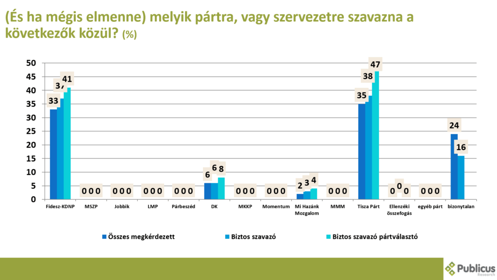 A Tisza Párt helyi szinten is vezet a pártok támogatottságában, a Fidesz némileg lemaradva követi. A biztos szavazók körében a Tisza Párt 47 százalékos, míg a Fidesz 41 százalékos támogatottsággal rendelkezik. A választókerületben csak a DK lépné át az 8 százalékos parlamenti küszöböt, (a Mi Hazánk is 4 százalékon áll jelenleg). A bizonytalanok aránya 16 százalék.