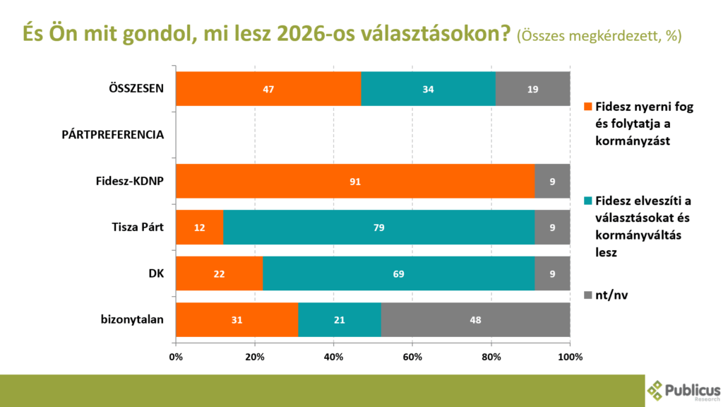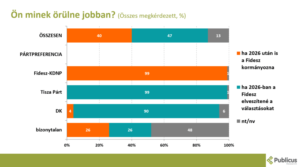 A válaszadók relatív többsége, azaz közel minden második megkérdezett (47 százalék 40 százalék ellenében) annak örülne jobban, ha 2026-ban a Fidesz elveszítené a választásokat.