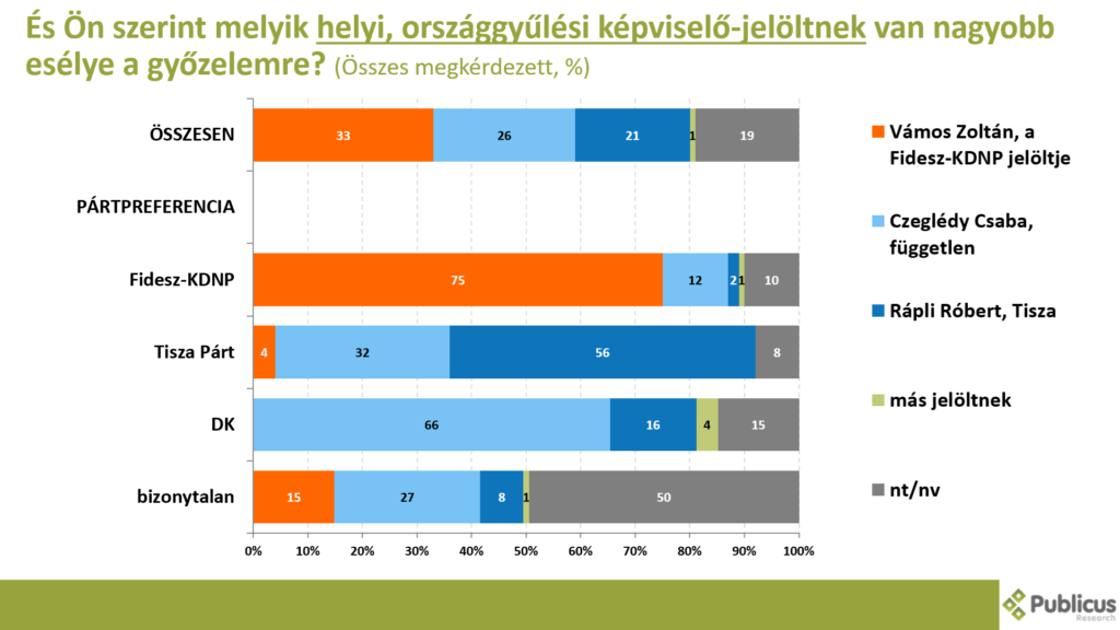 A válaszadók harmada (33 százalék) szerint a helyi, országgyűlési képviselő-jelöltek közül Vámos Zoltánnak van a legnagyobb esélye a győzelemre. Így nyilatkozott a Fidesz szavazók 75 százaléka, a bizonytalan szavazók 15 százaléka, illetve a Tisza Párt szavazóinak a 4 százaléka.