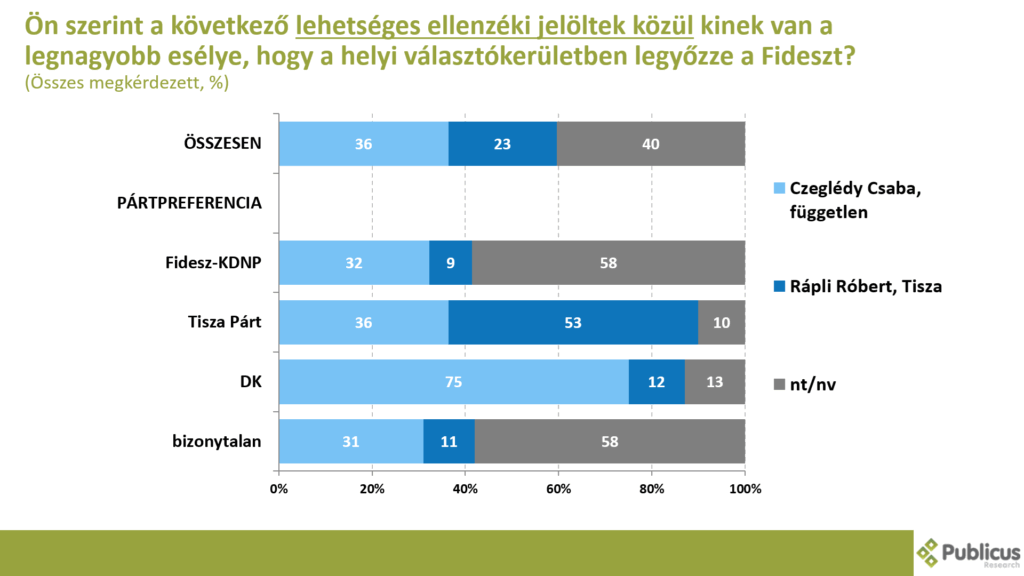 A lehetséges ellenzéki jelöltek közül a válaszadók 36 százaléka szerint Czeglédy Csabának, 23 százalék szerint pedig Rápli Róbertnek van nagyobb esélye arra, hogy a helyi választókerületben legyőzze a Fideszt.