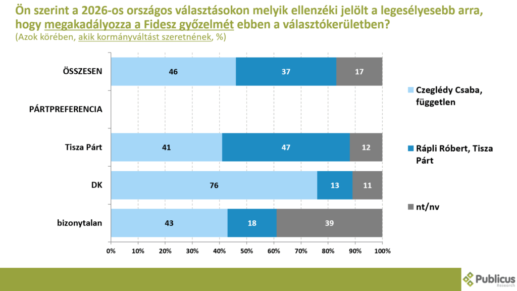 Azok körében, akik kormányváltást szeretnének, közel minden második (46 százalék) válaszadó szerint Czeglédy Csaba a legesélyesebb arra, hogy megakadályozza a Fidesz győzelmét ebben a választókerületben. Így gondolja a DK szavazók 76 százaléka, a bizonytalan szavazók 43 százaléka, illetve a Tisza Párt szavazóinak a 41 százaléka.