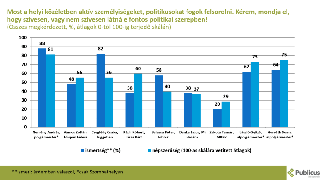 A potenciális képviselő-jelöltek közül Czeglédy Csaba a legismertebb (82 százalék), utána Balassa Péter (58 százalék, Jobbik) Vámos Zoltán (48 százalék, Fidesz), Rápli Róbert (38 százalék, Tisza Párt) és Danka Lajos (38 százalék, Mi Hazánk) következik.