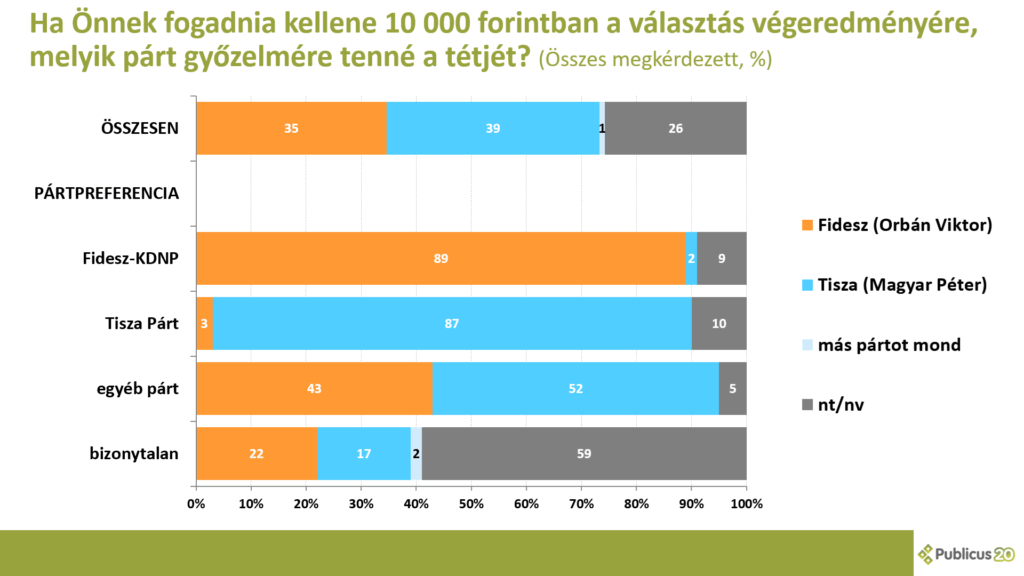 We have another metric that is perhaps even more honest than simple party preference: the forced choice. We presented a scenario: “If you had to bet 10,000 forints on the election outcome, who would you bet on?”